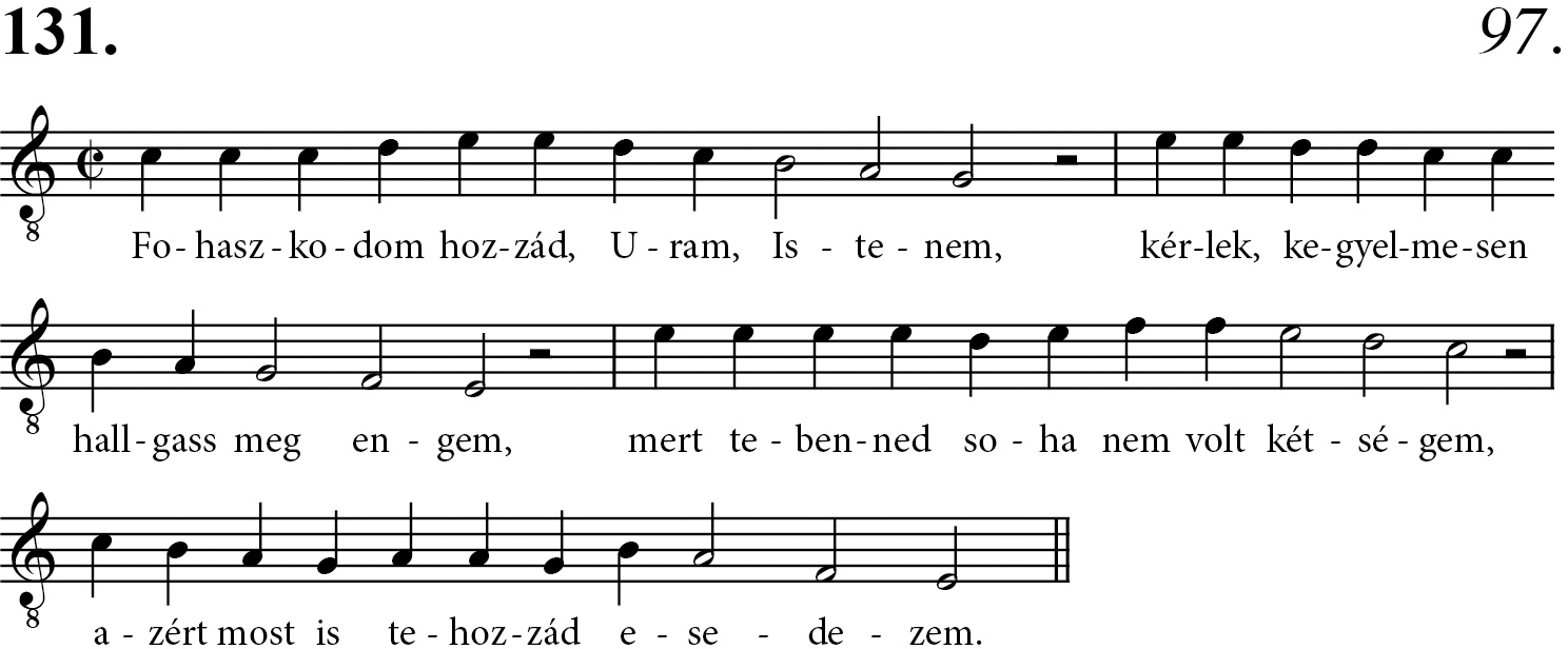 | Nótajelzés: | Fohászkodom hozzád, Uram, Istenem (RPHA 0421) Jézus Krisztus, mi kegyelmes hadnagyunk (RPHA 0668) Keresztyének, kik e Földön lakoztok (RPHA 0729) Nagy bánatban Dávid mikoron vala (RPHA 1024) Saulnak a Dávidhoz jó szerelme (RPHA 1209) Zúgódik, dúl-fúl magában e világ (RPHA 1496) |