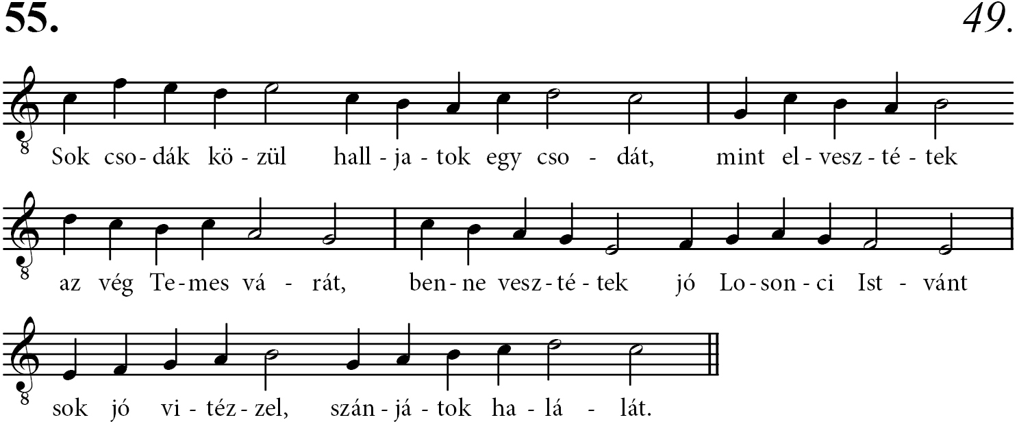 | Nótajelzésként: | Ohajt megrettent császár szörnyű kárán (RPHA 0743c) Minden szerencsén, Uram, kész én lelkem (RPHA 0964) Bosszúdat, ember, hagyd a nagy Istennek (RPHA 0211) Ki hallott Sándornál hatalmasb urat (RPHA 0743) Halljuk, elrégen atyánkkal mit tettél (RPHA 0513) |